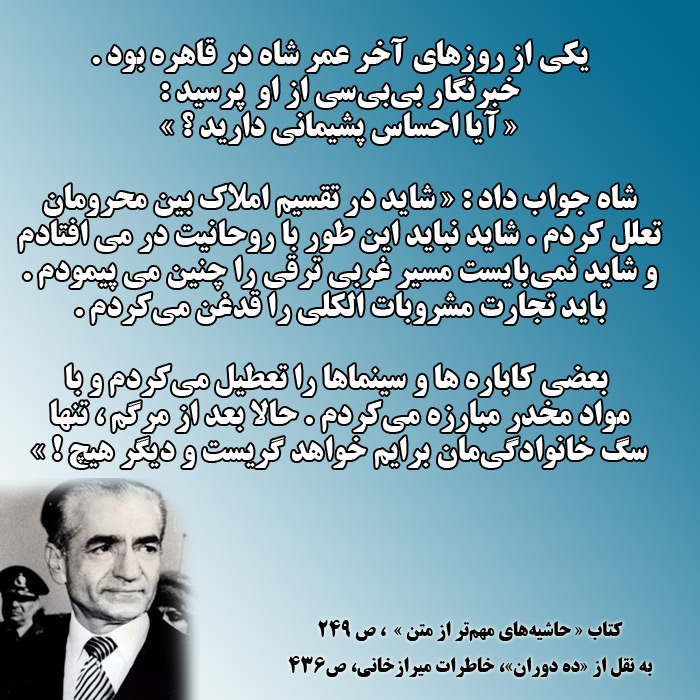 « شاید در تقسیم املاک بین محرومان تعلل کردم . شاید نباید این طور با روحانیت در می افتادم و شاید نمیبایست مسیر غربی ترقی را چنین می پیمودم . باید تجارت مشروبات الکلی را قدغن میکردم .